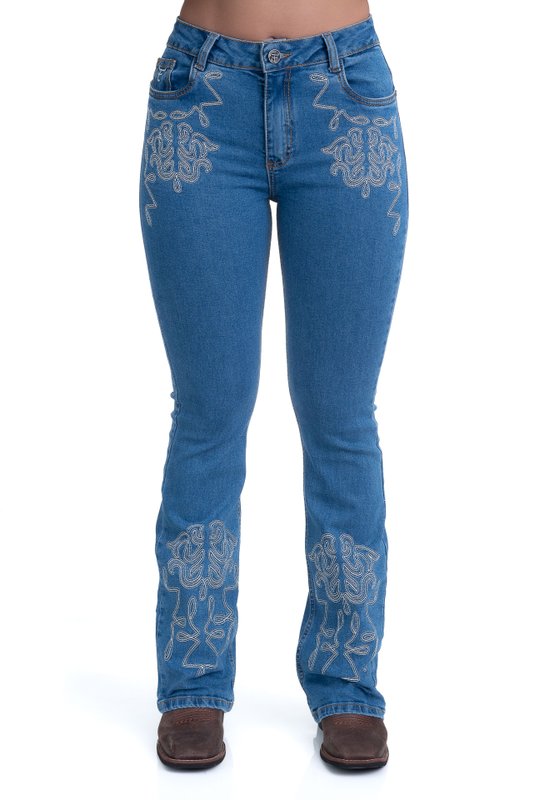 Produzida em jeans resistente e flexível, conta com bordados delicados nos bolsos traseiros, que trazem um toque exclusivo e sofisticado. Sua composição garante excelente caimento, toque macio e liberdade de movimento, enquanto a cintura média e o corte bem estruturado proporcionam ajuste perfeito ao corpo.
