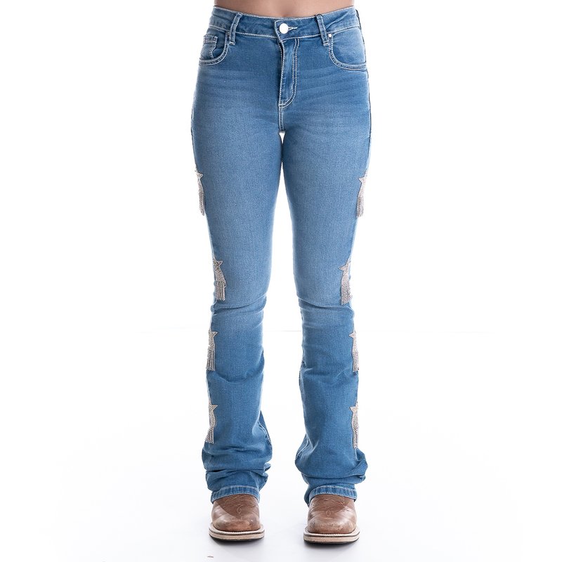 Confeccionada em tecido jeans 98% Algodão e 02% Elastano modelo bootcut. com detalhe em strass na pernas.