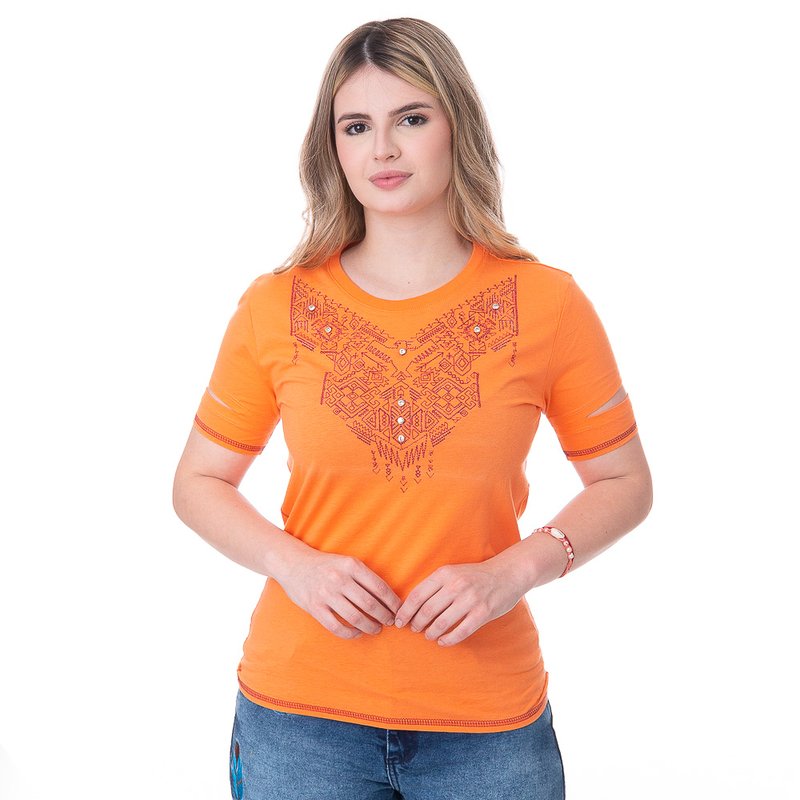 A Camiseta Feminina West Dust - Tribal - BL25721 - Laranja é uma peça que destaca o estilo western com um toque vibrante. Feita 100% em algodão, ela oferece conforto e durabilidade, ideal para quem busca praticidade no dia a dia. A estampa tribal em alta definição dá um visual autêntico, perfeito para eventos como rodeios e festas sertanejas. Além disso, sua cor laranja brilhante traz energia e originalidade ao look. Com manga curta e gola redonda, essa camiseta é uma escolha versátil para compor produções despojadas e cheias de personalidade